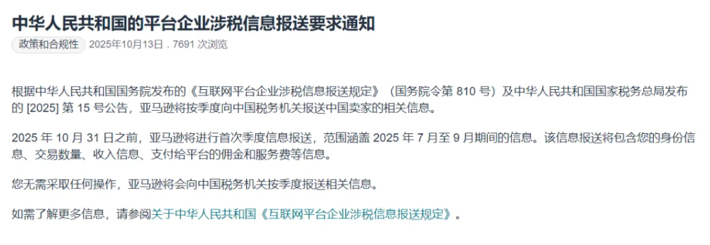 10月13日,亚马逊正式向卖家发布关于“涉税信息报送”的通知,明确表示将按季度向中国税务机关报送包括身份信息、交易数量、收入信息、支付给平台的佣金与服务费等信息。首次报送将于10月31日前完成,数据涵盖2025年7月至9月的交易。此前,亚马逊 20 个站点已完成涉税申报备案,卖家务必关注税务合规问题。