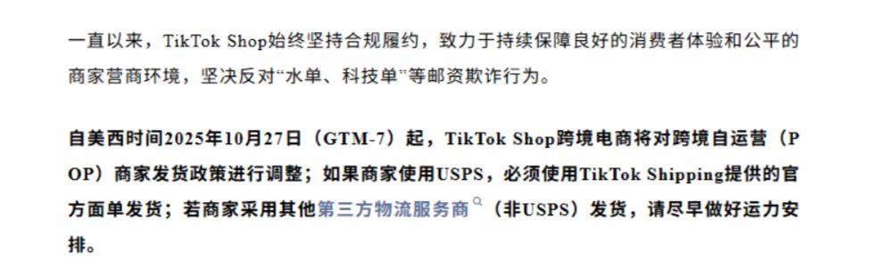 据平台官方消息,自美西时间2025年10月27日起,TikTok Shop将对跨境自运营(POP)商家使用USPS自发货进行限制;此次调整仅针对使用USPS物流自发货的订单,其他物流渠道如UPS、FedEx、DHL等第三方服务商不受影响,可正常使用。