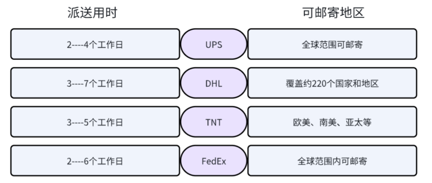 目前,世界上有几个比较知名的国际商业快递公司,分别是UPS、DHL、TNT及FedEx。下图对比了几个公司的基本情况,可供跨境电商卖家参考。
