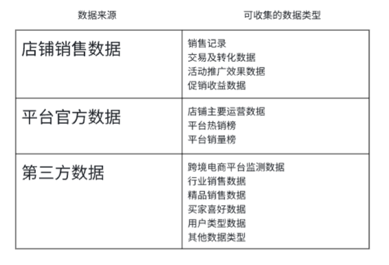 其次,收集数据。在确定数据分析目标之后,要根据目标来收集数据。跨境电商运营的数据收集主要有三个方面,包括店铺本身的销售数据,平台的官方数据及第三方数据。