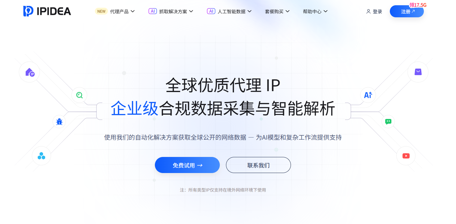 全球优质代理IP,合规数据采集与智能解析,始终致力于为用户提供安全、稳定、高效的数据抓取、定制数据集服务,满足AI大模型数据采集、社媒营销以及市场调查等多种业务场景。